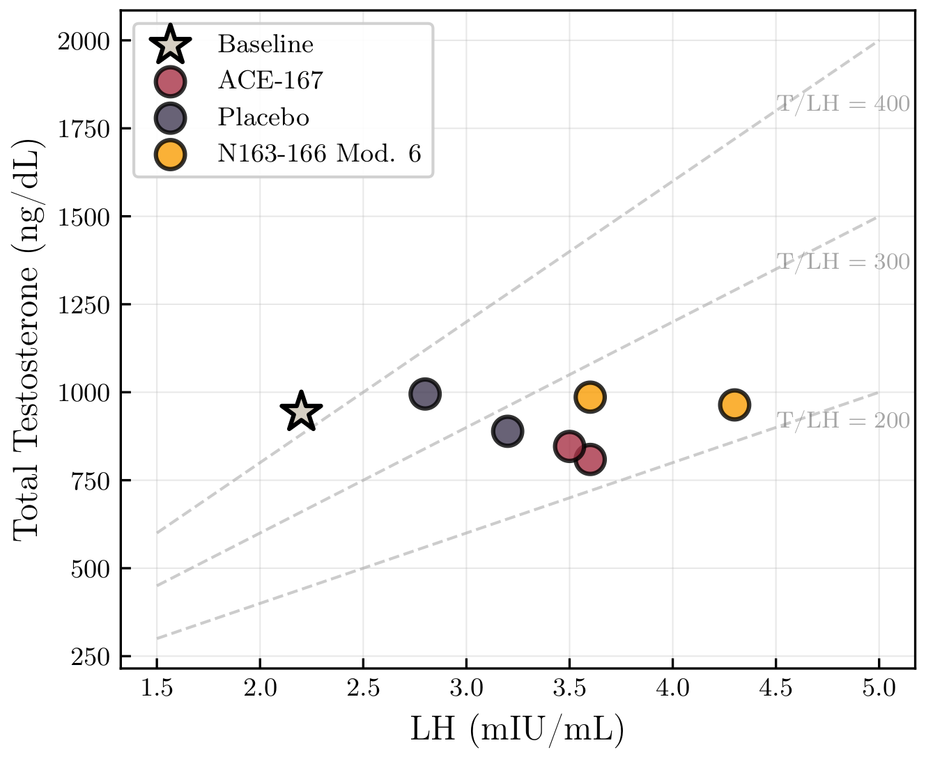 The testosterone-to-LH ratio fell by ~25–45%