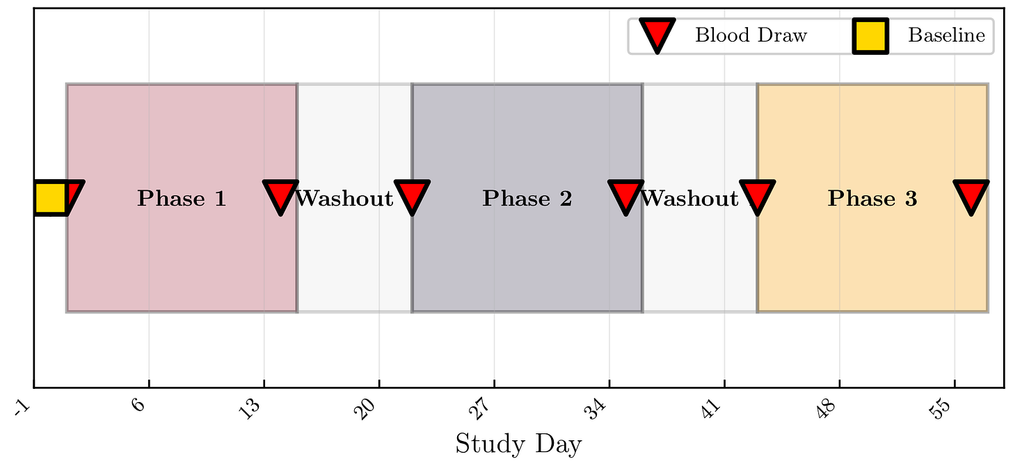 Timing caveat: blood draws were fixed at ~2 hours post-dose, extrapolated from rodent oral-dosing data. If peak effects in humans occur earlier, later, or require longer accumulation, this design would miss them. The null result therefore applies specifically to effects present at the 2-hour window.
